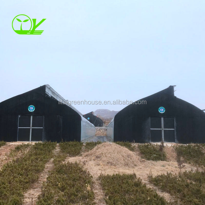 A estufa de cogumelos tem dois tipos: um é uma estufa de revestimento de filme preto e branco, outro é uma pequena estufa de túnel em uma estufa maior com rede de aquecimento.